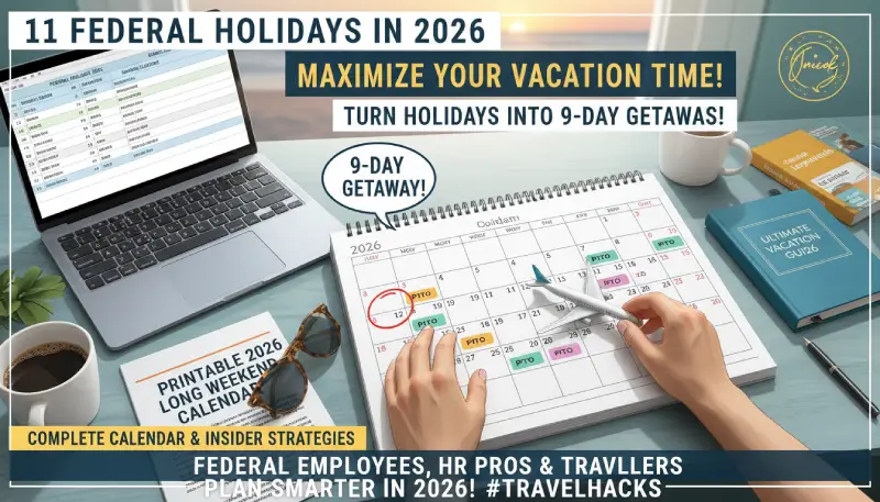 Discover all 11 federal holidays in 2026 and learn how to maximize your vacation time! Our ultimate guide reveals insider strategies to turn holidays into 9-day getaways using just 4 PTO days. Includes complete calendar, payroll deadlines, banking closures, and state-specific variations. Perfect for federal employees, HR professionals, and travelers planning ahead. Get long weekend tips, printable calendars, and expert advice on Independence Day observances, Juneteenth, and more. Plan smarter in 2026!