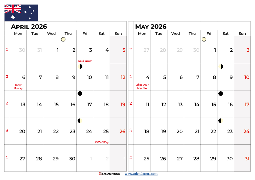 Download our April May 2026 Calendar With Holidays Australia in PDF or JPG format to access this expanded planning perspective. The two-month view works particularly well printed at A3 size for wall display in family command centers or office spaces.