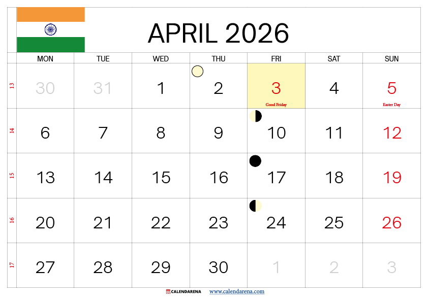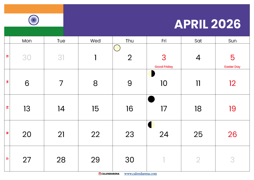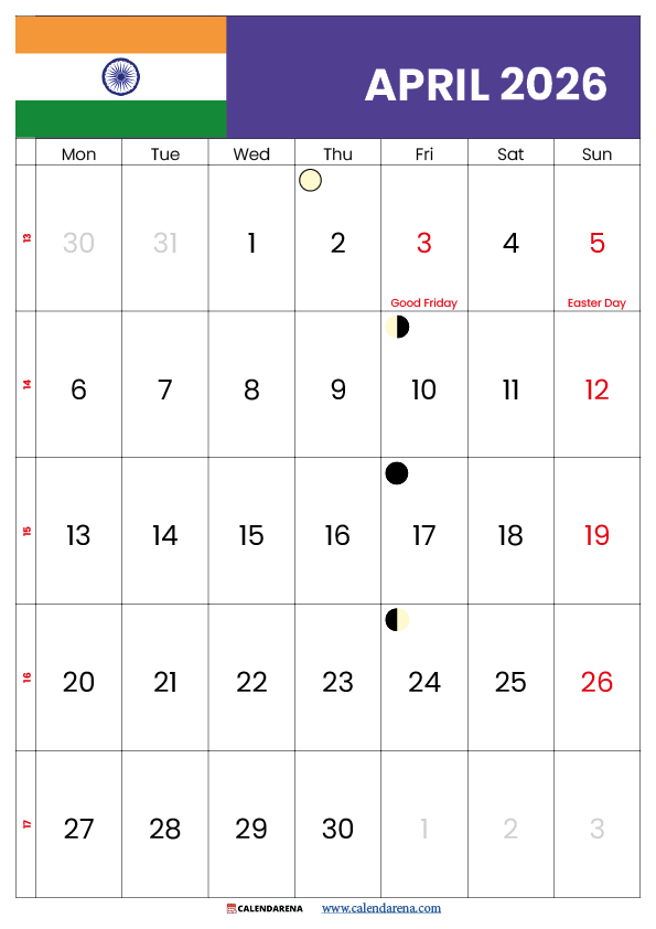 Our website offers free downloadable April 2026 Calendar With Holidays India PDF versions that include all major festivals, observances, and moon phases. These professionally designed calendars are print-ready and optimized for both home and office use. Simply download the PDF file, print it on A4 or Letter size paper, and display it prominently for easy reference throughout the month.