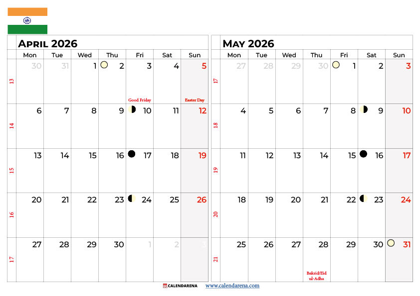 Academic Planning: Students and educators use two-month calendars to track semester schedules, examination periods, and assignment deadlines that often span multiple months. The April-May view captures the crucial end-of-academic-year period for many Indian schools and universities.