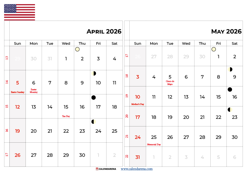 - Facing Pages Layout: April and May print on separate pages designed to be placed side-by-side, optimizing space for detailed notes while maintaining the two-month visual advantage.