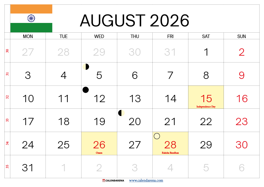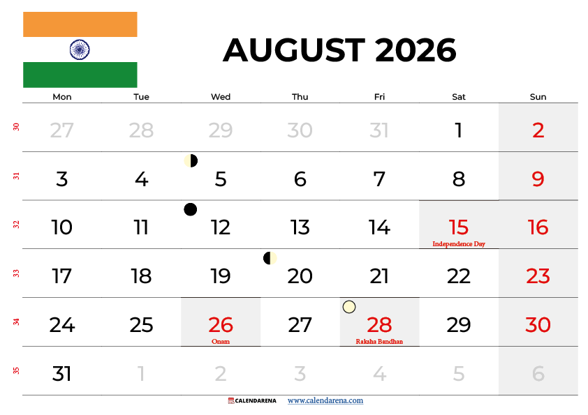 Download the August 2026 Calendar India — Free PDF and PNG