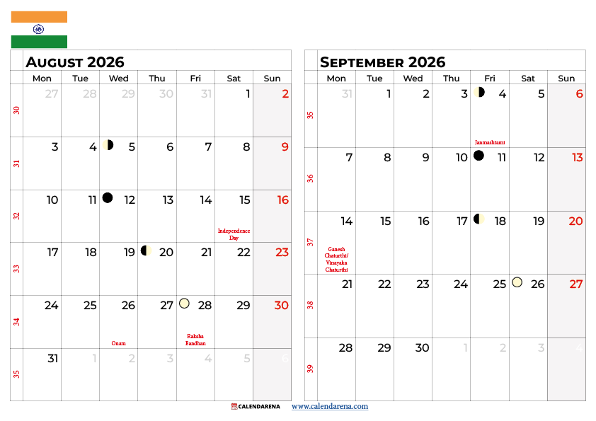 Yes. Calendarena offers a free august september 2026 calendar with holidays india as a two-month printable PDF and PNG. It covers all national and state public holidays across both months, including Independence Day in August and all September 2026 gazetted holidays. No registration is required to download.