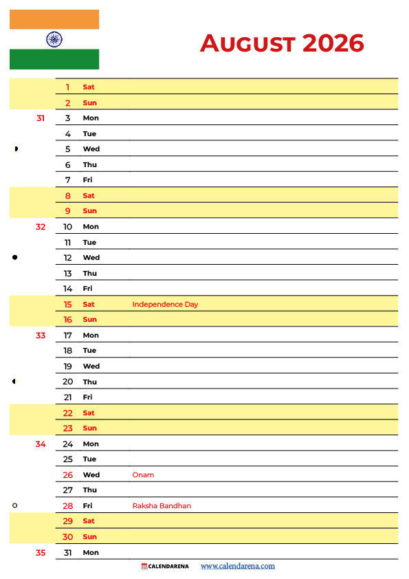 You can download the august 2026 calendar with holidays india for free on Calendarena. Both PDF and PNG formats are available with all public holidays pre-marked, including Independence Day and Raksha Bandhan. No account or sign-up is needed — simply choose your format and print or save directly.