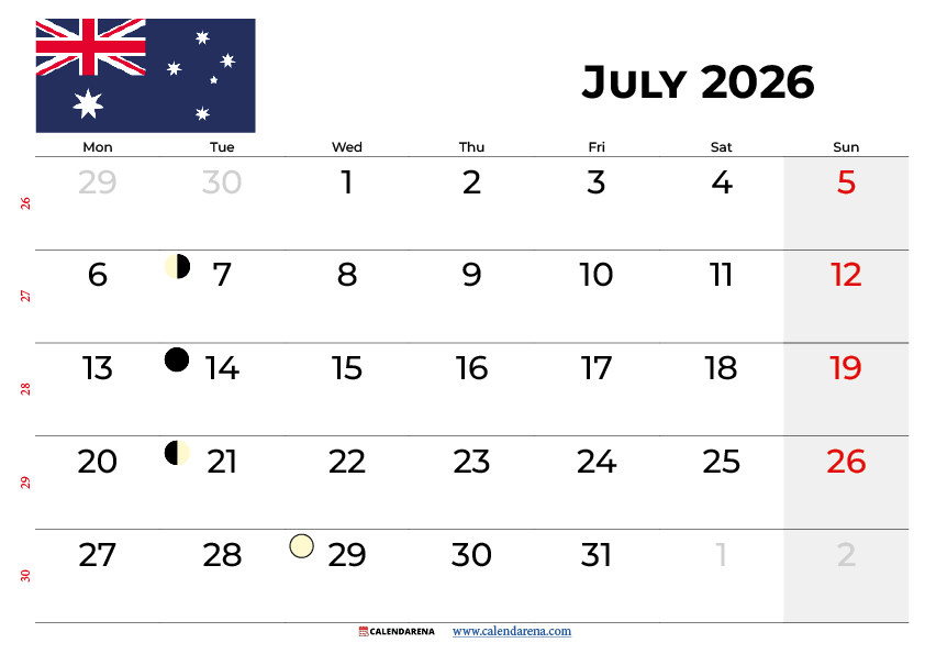 The July 2026 Calendar Australia starts on Wednesday, July 1st, and concludes on Friday, July 31st, offering 31 days of planning opportunities. Unlike many other months, July 2026 contains no nationwide public holidays in Australia, making it primarily a working month for most adults while providing essential winter break time for students across the country.