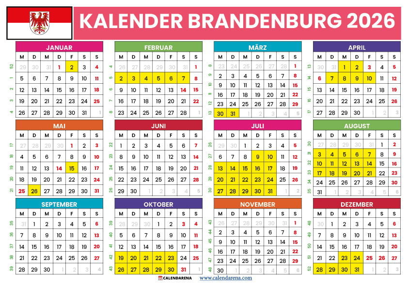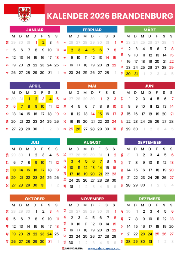 Mit unserem kostenlosen Jahreskalender haben Sie alle wichtigen Termine für Brandenburg 2026 stets im Blick. Die Ferien Brandenburg 2026 und alle gesetzlichen Feiertage sind übersichtlich dargestellt und helfen Ihnen bei der optimalen Planung von Urlaub, Ausflügen und Familienzeit.