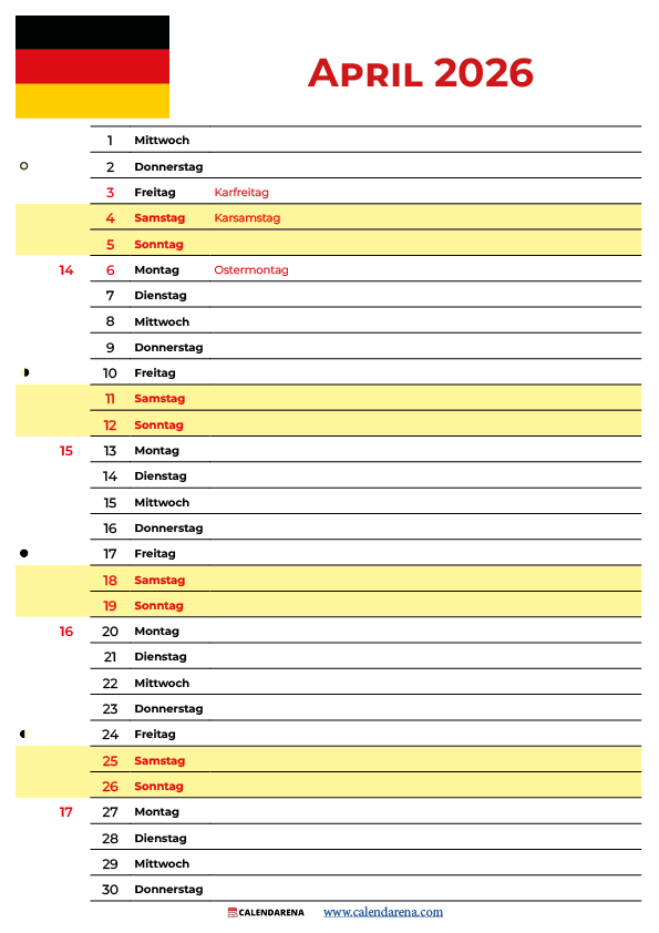 Druckbarer Kalender April 2026 Mit Feiertagen