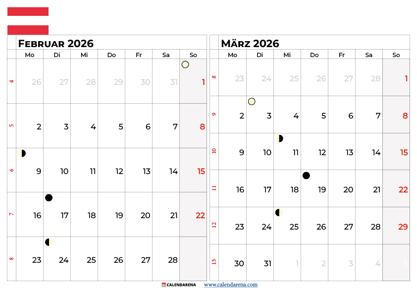 Ein kombinierter Februar März 2026 Kalender Österreich bietet erweiterte Planungsmöglichkeiten: