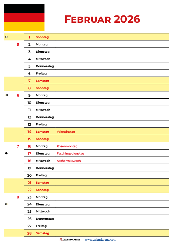 Der Februar 2026 Kalender beinhaltet mehrere bedeutende Feiertage und kulturelle Ereignisse in Deutschland: