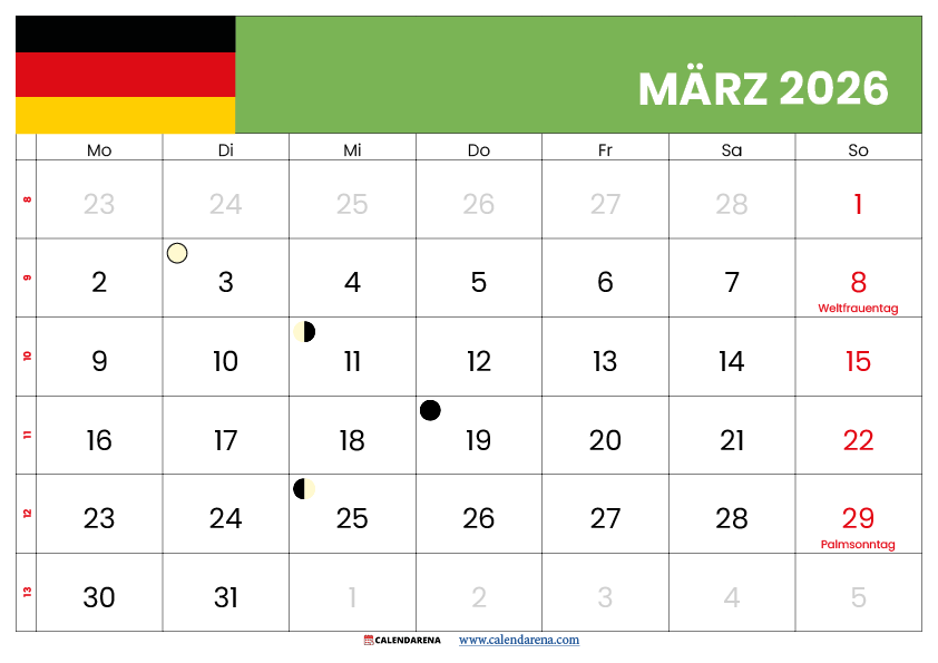 Unsere Website bietet kostenlose Kalender März 2026 zum Ausdrucken mit eingetragenen Feiertagen. Diese Vorlagen sind in PDF- und JPG-Format verfügbar und enthalten: