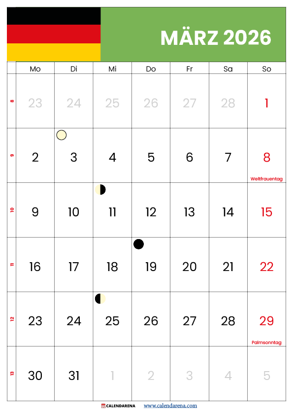 Der Kalender März 2026 mit Feiertagen enthält mehrere bedeutende Tage für Deutschland: