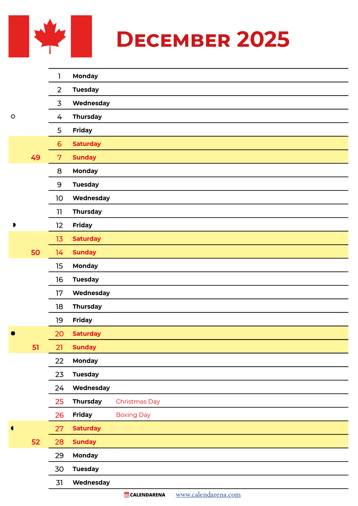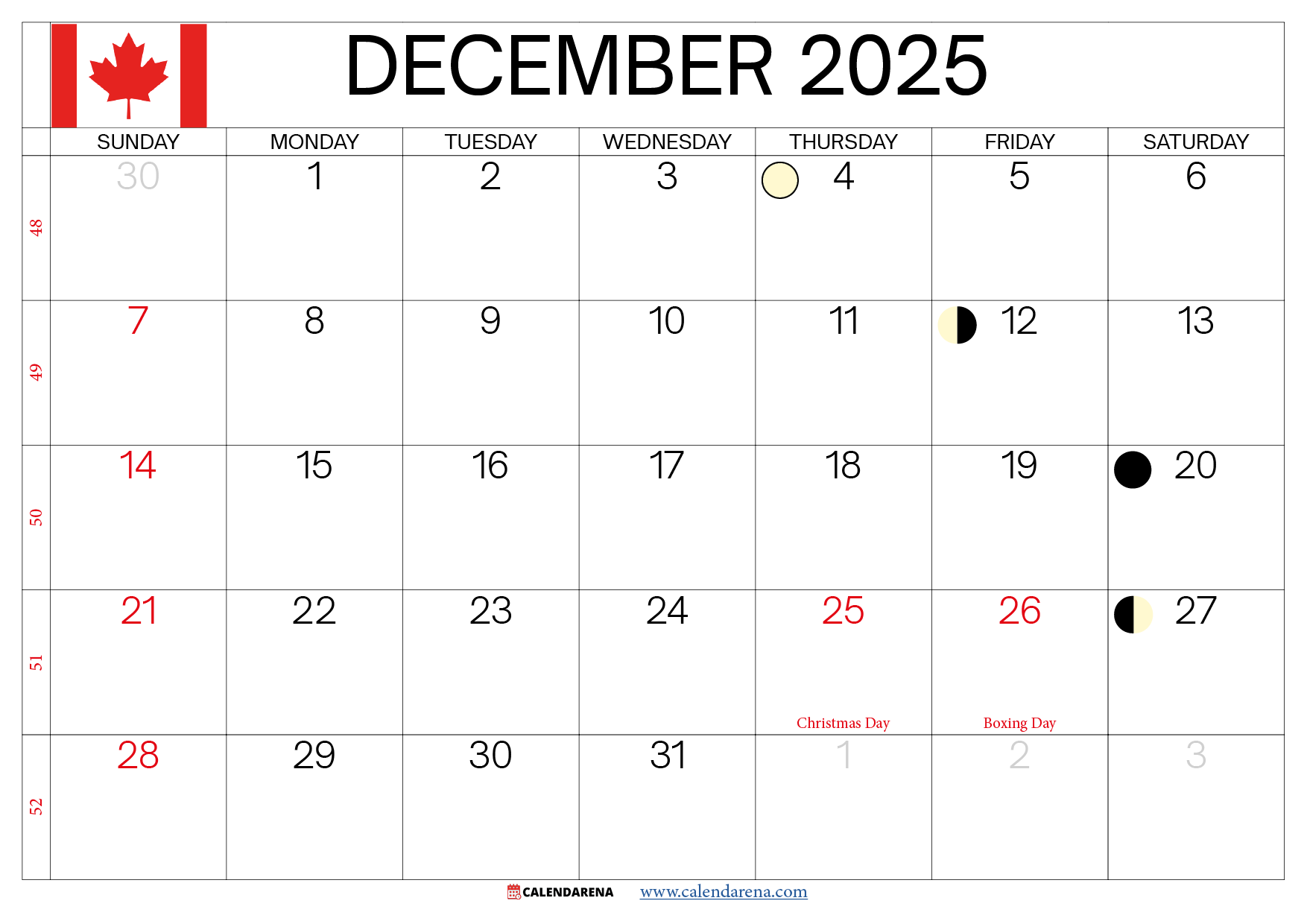 December 2025 Calendar Canada Printable