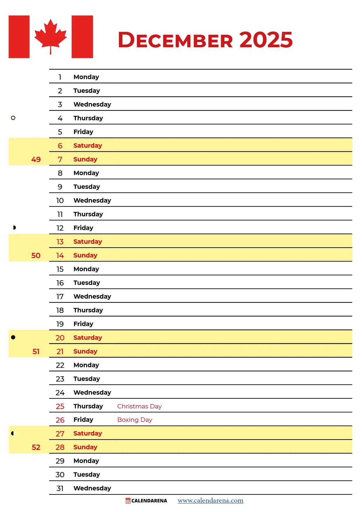 December Calendar 2025 Canada
