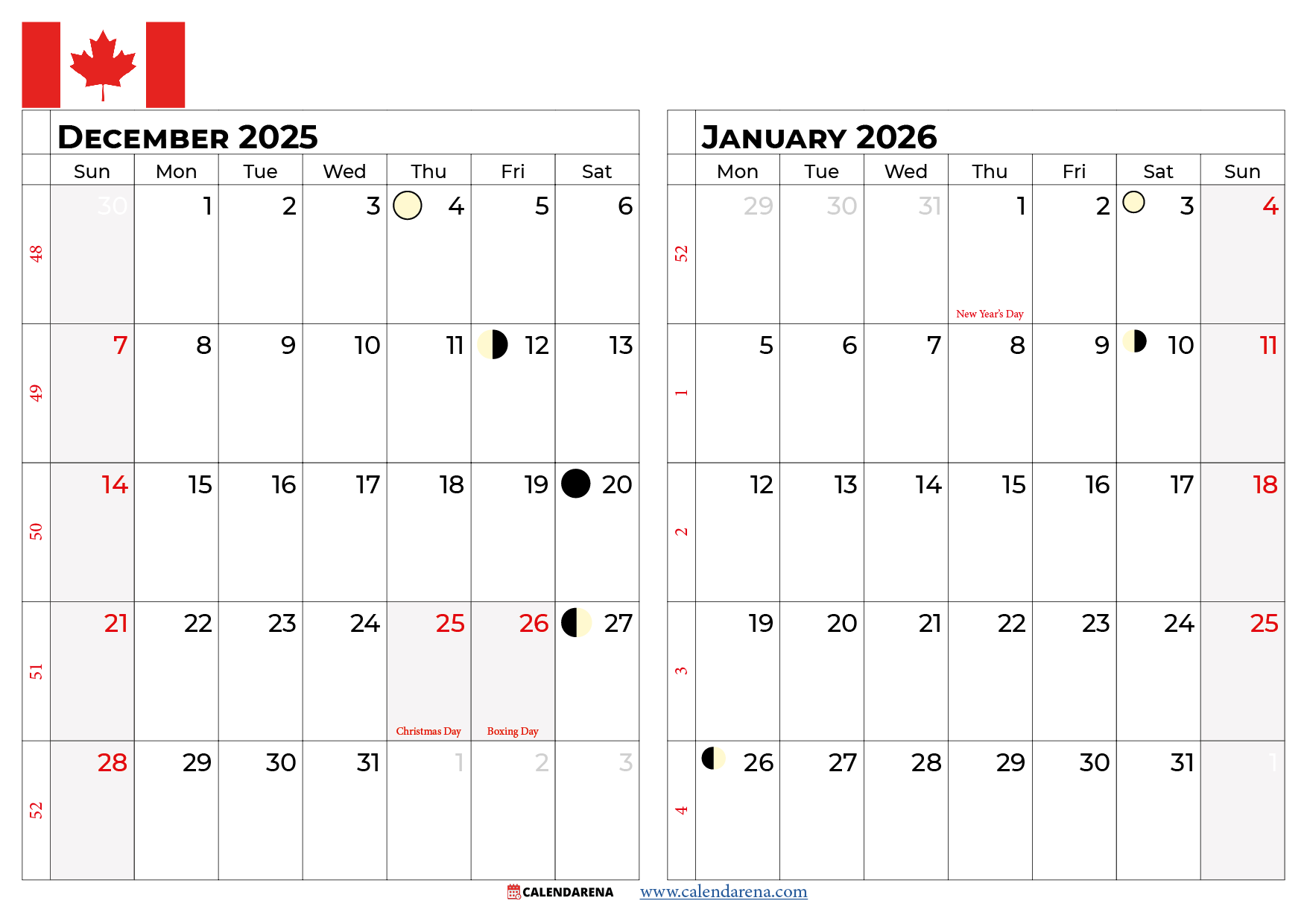December 2025 January 2026 Calendar Canada