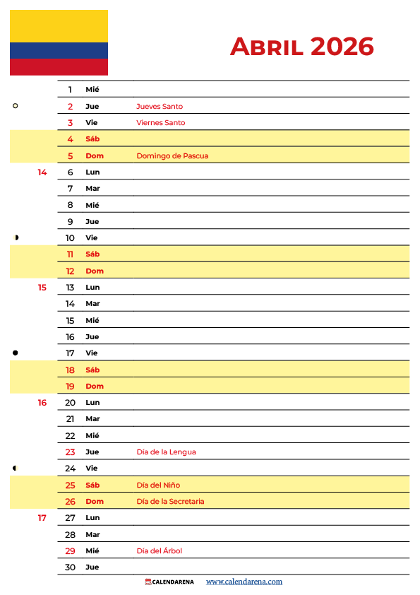 El Calendario Abril Colombia 2026 Colombia en blanco es perfecto para implementar técnicas avanzadas de gestión del tiempo: