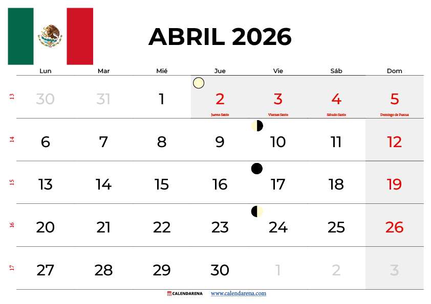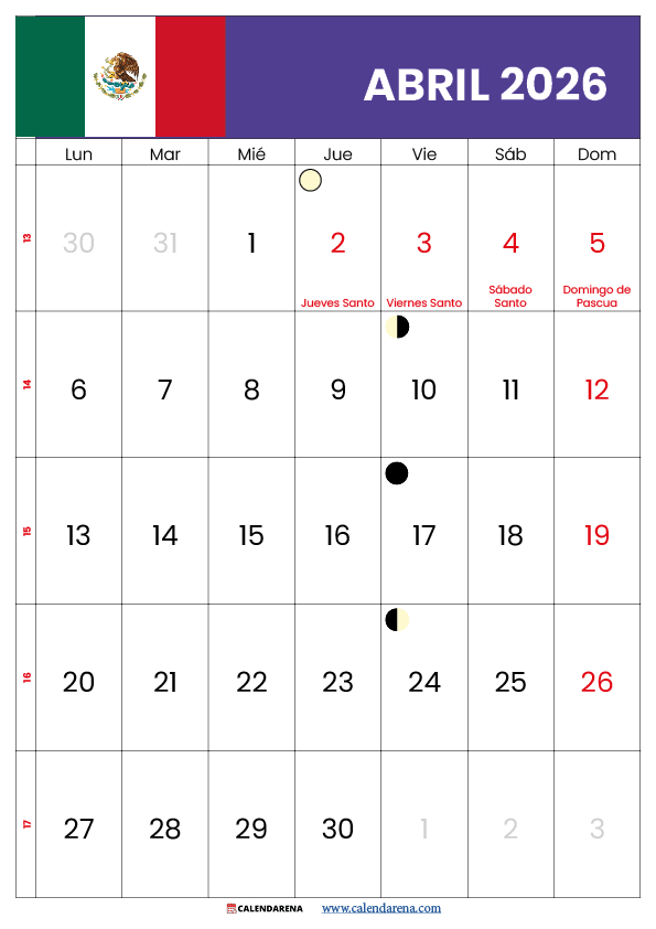 Calendario Abril 2026 Mexico