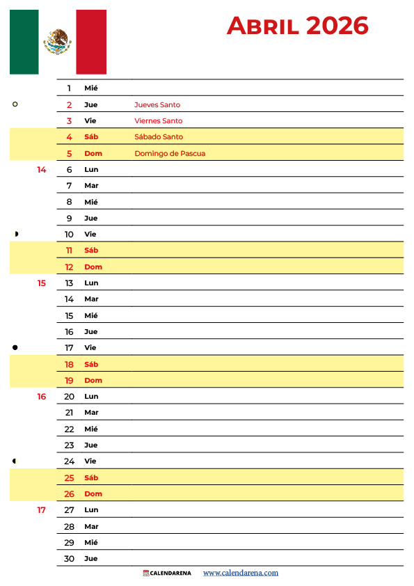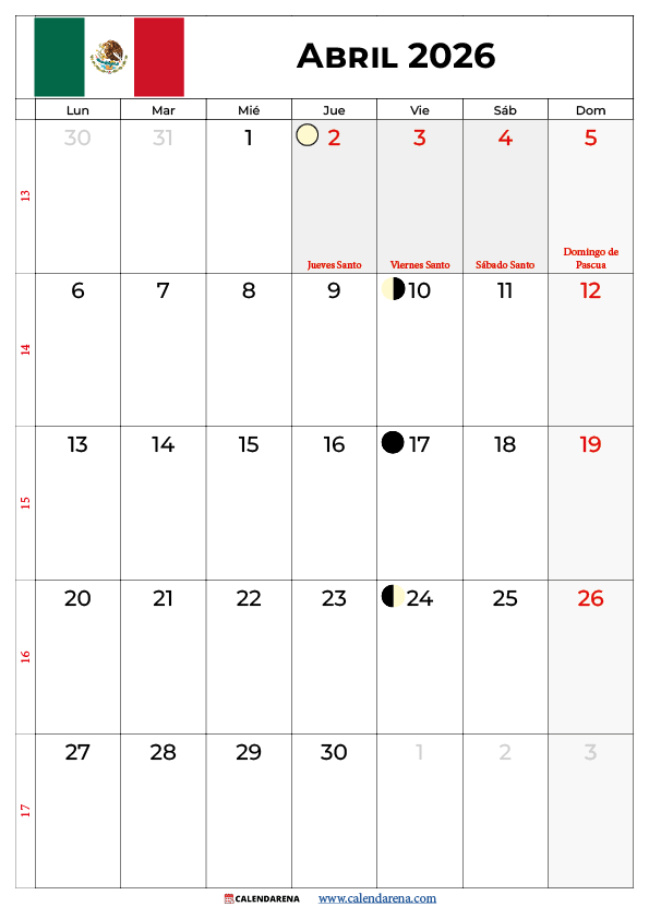 Abril 2026 Calendario Mexico