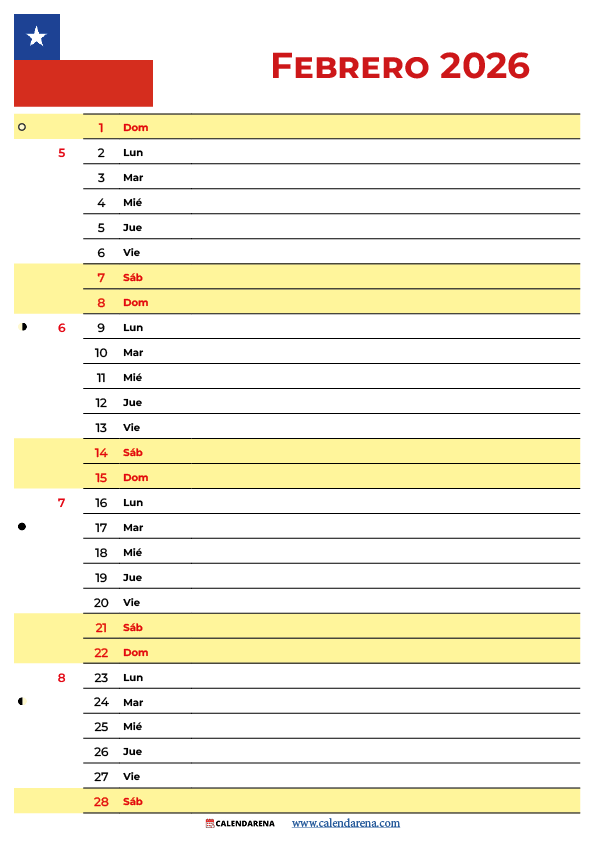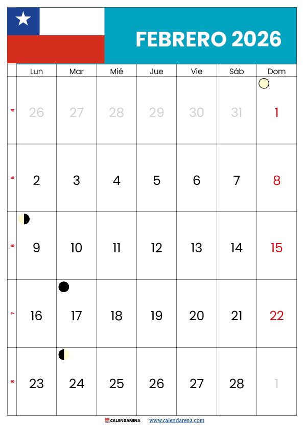 Nuestro Calendario Febrero 2026 Chile Para Imprimir incluye todas las conmemoraciones y fases lunares claramente marcadas. El diseño está optimizado para impresión en alta calidad, con espacios amplios en cada día para añadir tus propias notas y recordatorios.