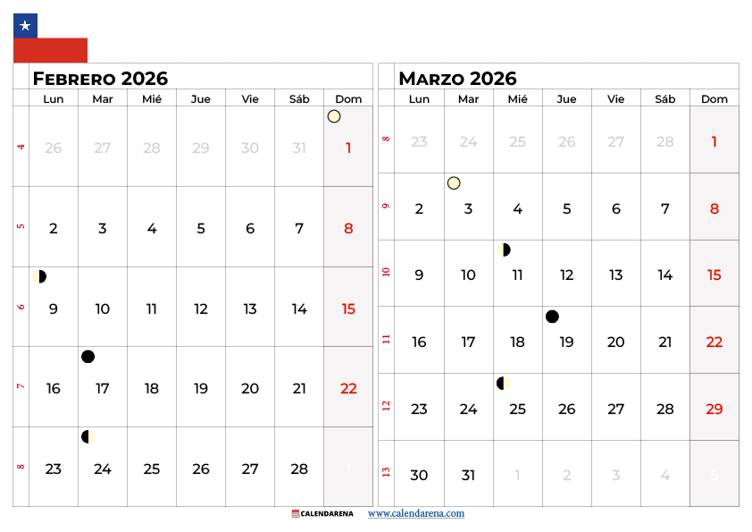 Un Calendario Febrero Y Marzo 2026 Chile que muestre ambos meses simultáneamente ofrece ventajas significativas para planificación de mediano plazo: