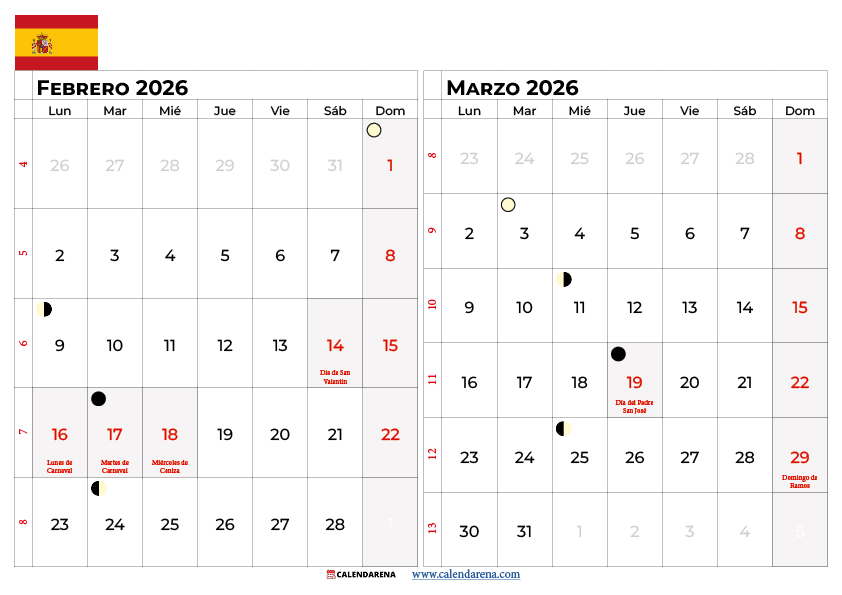 Calendario Febrero Marzo 2026 Para Imprimir España: Calendarios Bimestrales
