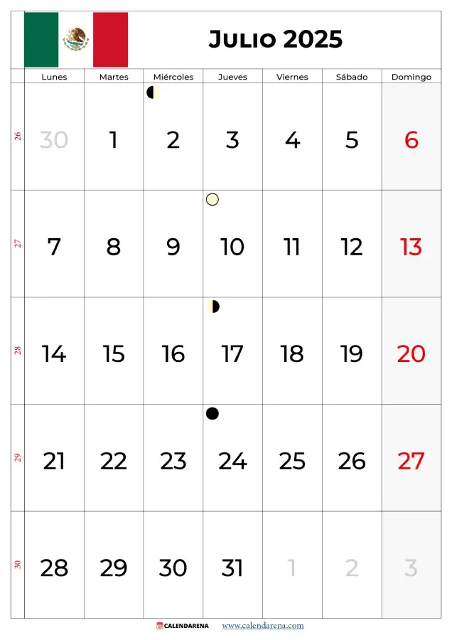 Si estás buscando un Calendario Julio 2025 México para planificar tu mes de manera eficiente, has llegado al lugar correcto. En nuestra página, ofrecemos calendarios gratuitos en formatos JPG y PDF que puedes descargar e imprimir fácilmente. El mes de julio de 2025 tendrá 31 días, comenzando un martes 1 de julio y terminando un jueves 31 de julio. A continuación, te contamos todo lo que debes saber sobre este mes tan especial en México, desde las fases de la luna hasta los eventos más importantes.