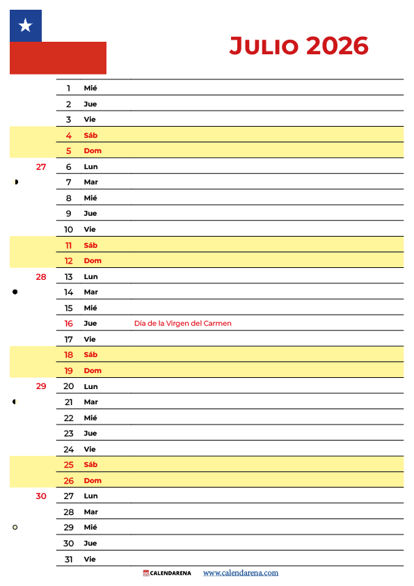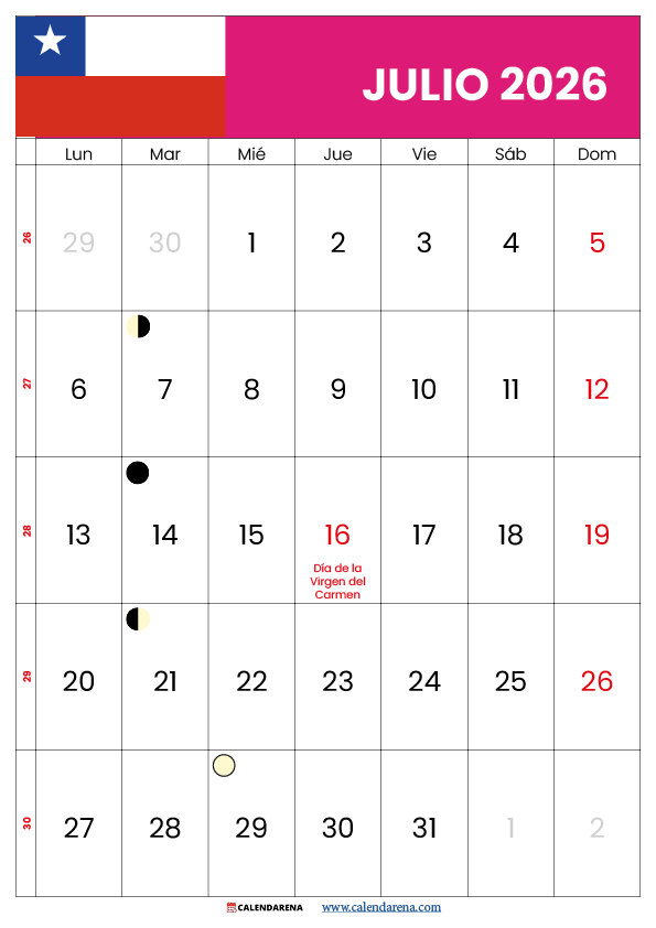 ¿Buscas el calendario julio 2026 Chile para imprimir con feriados y eventos importantes? En Calendarena puedes descargar el calendario julio Chile 2026 completamente gratis en formato PDF y PNG, disponible en orientación horizontal (landscape) y vertical (portrait), listo para imprimir desde casa, la oficina o el celular.