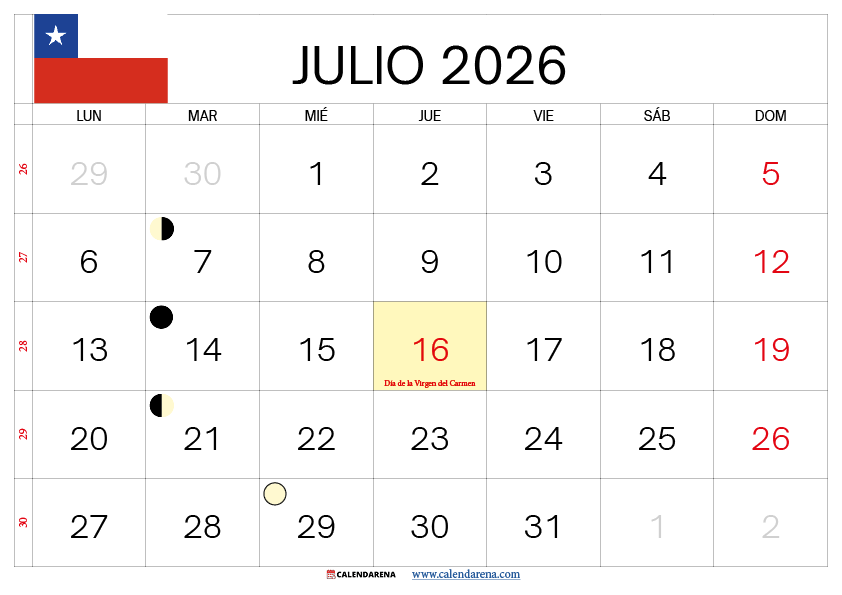A continuación encontrarás la vista completa del julio 2026 calendario Chile con el feriado marcado: