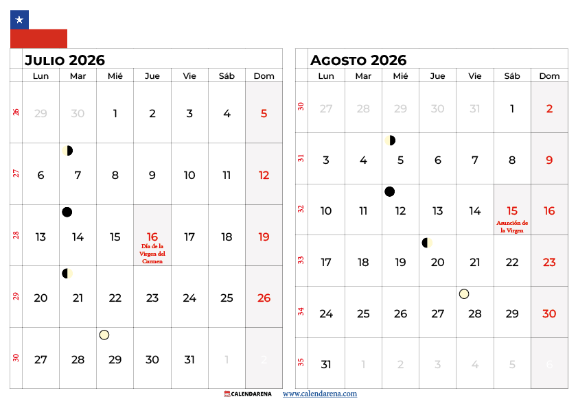 Calendario Julio Agosto 2026 Chile Para Imprimir – Descarga Gratis PDF y PNG