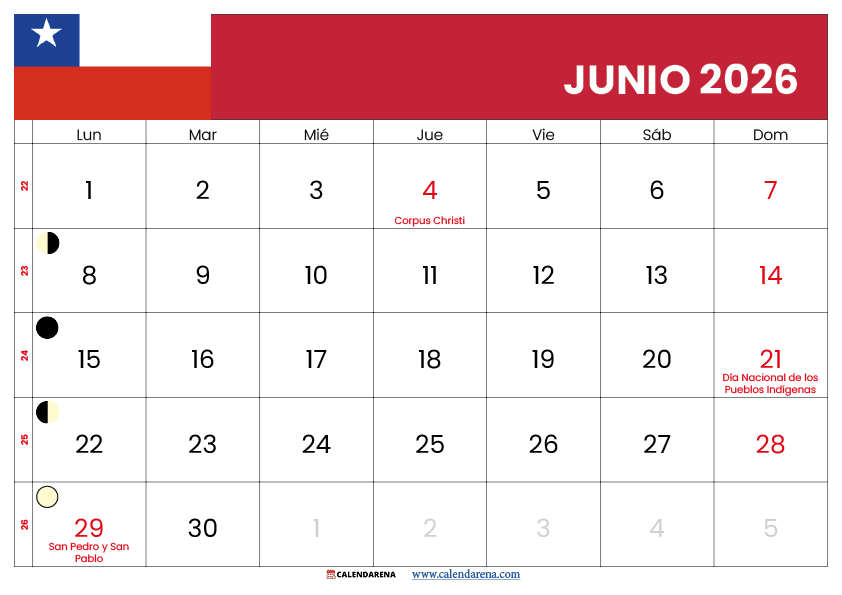 El calendario de junio 2026 Chile comienza un lunes 1 de junio y cuenta con 30 días completos. Este mes se caracteriza por ser el primero del invierno austral, iniciando oficialmente el 21 de junio con el solsticio de invierno. La distribución del mes presenta cuatro semanas completas más dos días adicionales, facilitando la organización de actividades semanales.