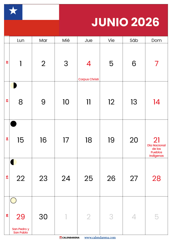Calendario Junio 2026 Chile Con Feriados Imprimible