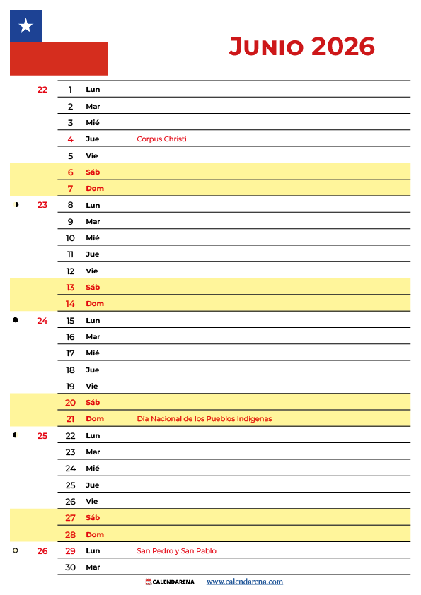 Descarga ahora tu calendario gratuito de junio 2026 y comienza a planificar un mes productivo y organizado. Suscríbete a nuestras actualizaciones para recibir calendarios mensuales, recordatorios de feriados y consejos de productividad directamente en tu correo. ¡Transforma tu planificación con herramientas diseñadas específicamente para Chile!