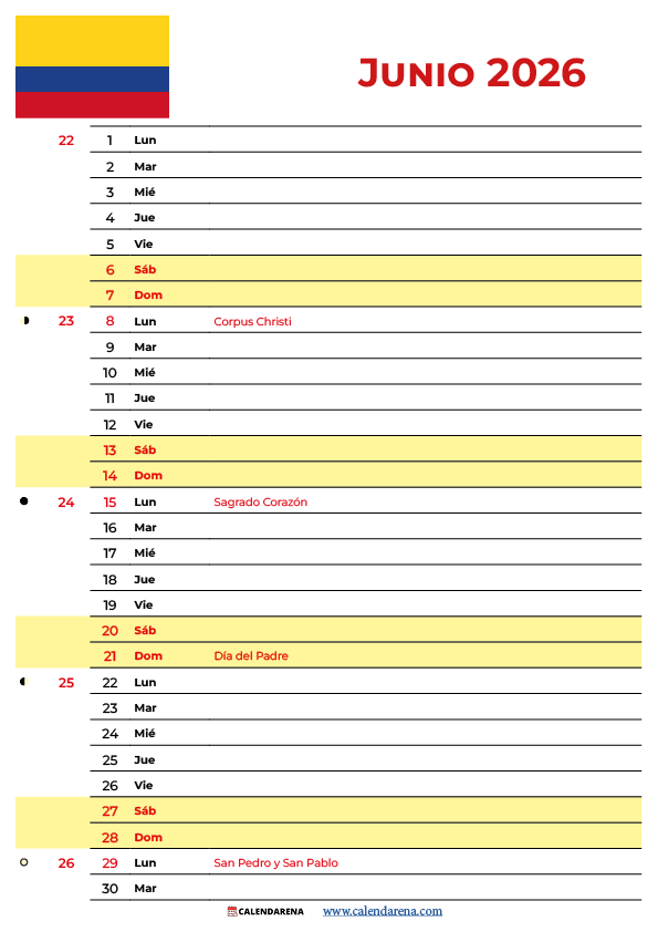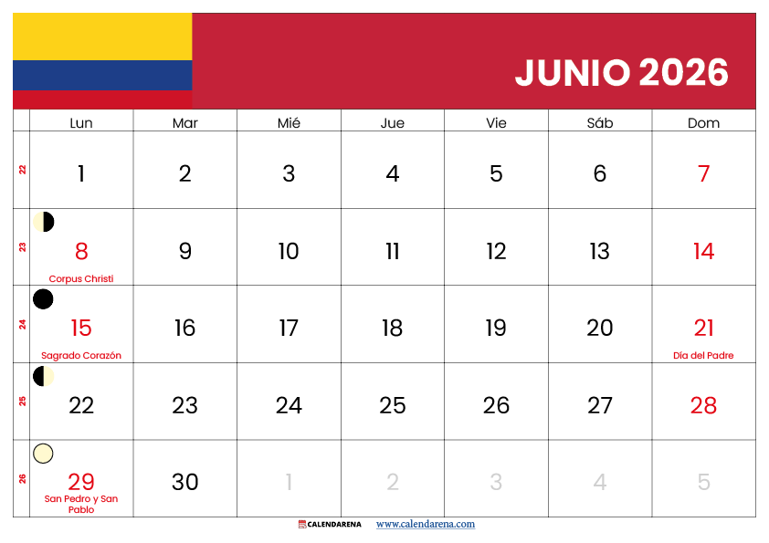Ya sea que busques el calendario junio 2026 con festivos Colombia para planificar tus vacaciones, organizar eventos laborales o simplemente estar al tanto de los días no laborables, aquí encontrarás toda la información verificada y actualizada.