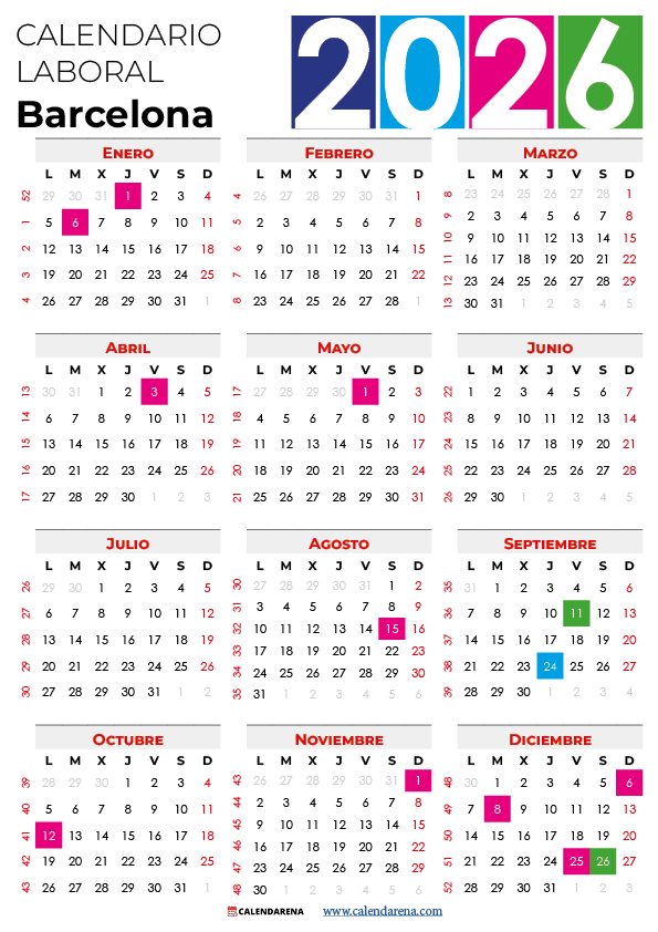 El calendario laboral 2026 barcelona incluye todos los días festivos oficiales establecidos por la Generalitat de Cataluña y el Ayuntamiento de Barcelona. Este calendario laboral 2026 barcelona es fundamental para empresas y trabajadores que necesitan planificar el año con antelación. Descarga gratis nuestros calendarios en formato PDF y JPG para tener siempre a mano las fechas importantes del año.