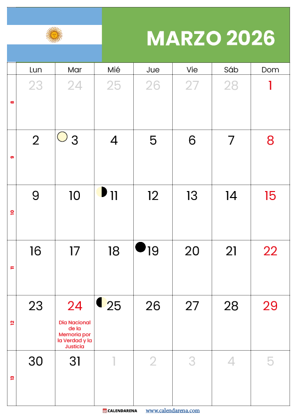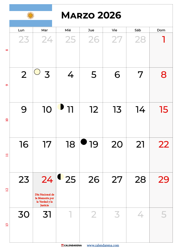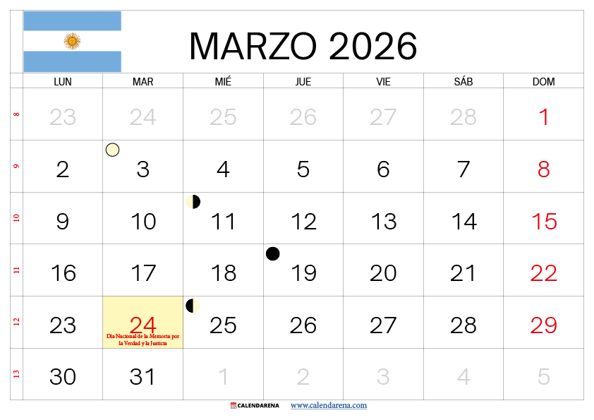 El Calendario Marzo 2026 Argentina comienza el domingo 1 de marzo y finaliza el martes 31 de marzo, abarcando 31 días completos. Este mes incluye importantes conmemoraciones nacionales, eventos astronómicos relevantes y fechas significativas para la comunidad argentina.