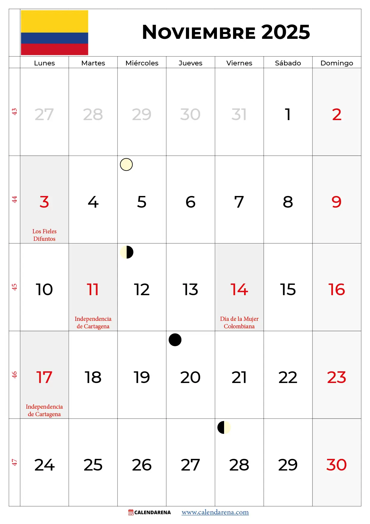 Puedes descargar un calendario completo y actualizado de noviembre 2025 para Colombia en Calendarr.com. Ofrecen versiones gratuitas en diferentes formatos.