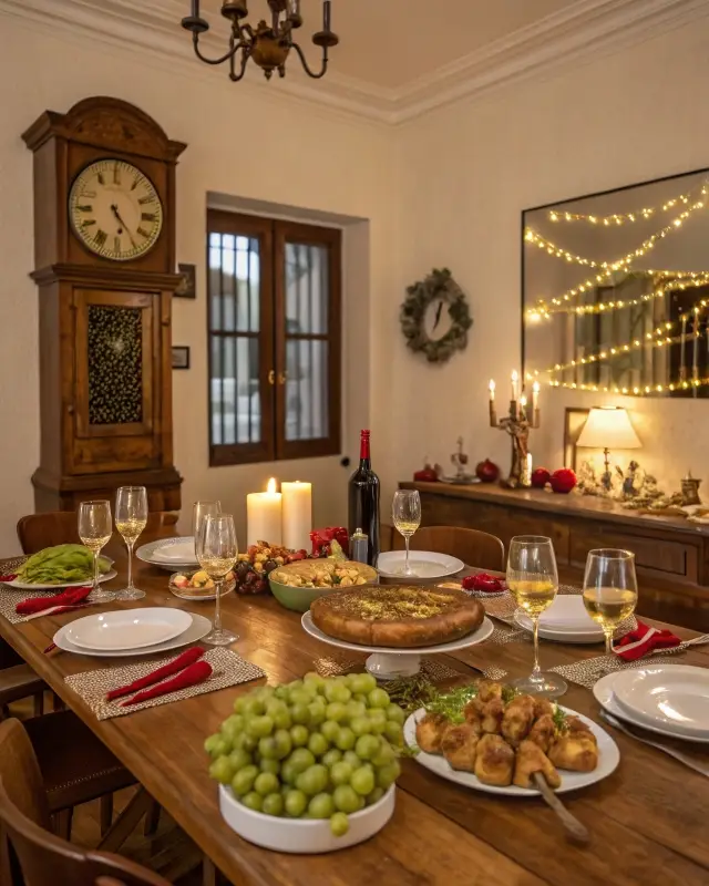 La noche del 31 de diciembre comienza invariablemente con la cena familiar de Nochevieja. Esta comida especial reúne a familiares y amigos alrededor de la mesa para compartir los últimos momentos del año.