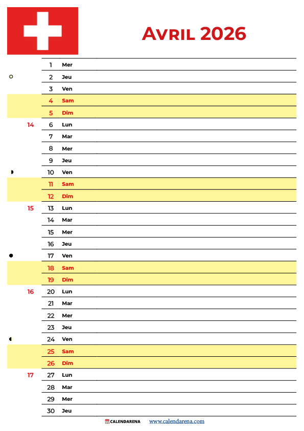 Calendrier Avril 2026 Suisse : Vue d’ensemble