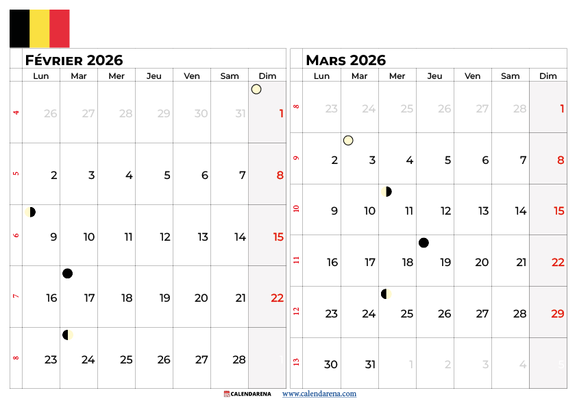 Calendrier Février Mars 2026 À Imprimer Belgique : Vue Bi-Mensuelle