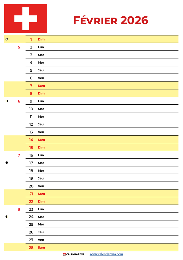 L’impression locale de votre Calendrier Février 2026 Pdf Suisse garantit également une personnalisation complète. Vous pouvez annoter, surligner et modifier librement votre calendrier selon l’évolution de vos priorités, une flexibilité difficile à reproduire numériquement.