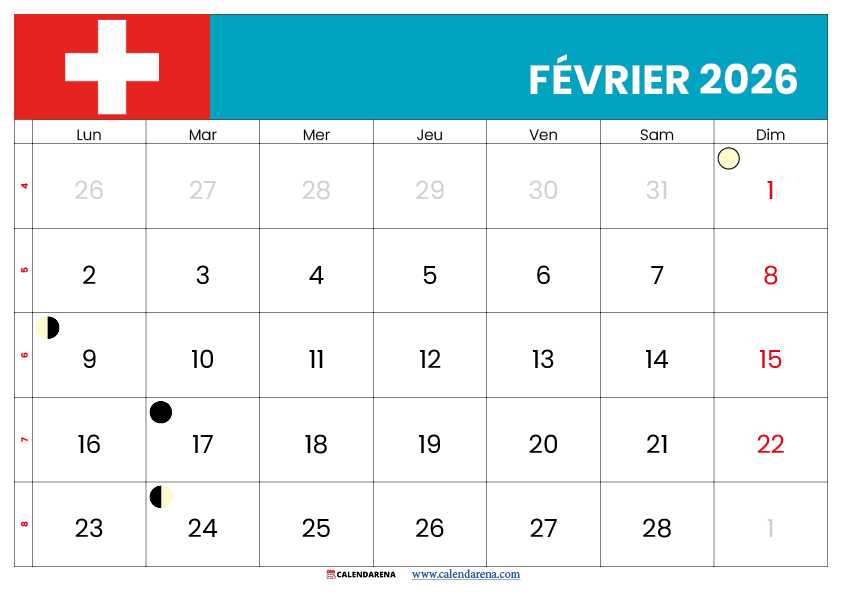 Notre plateforme met à disposition le Calendrier Février 2026 Pdf Suisse optimisé pour l’impression haute qualité. Le format PDF préserve la mise en page originale sur tous les appareils et systèmes d’exploitation, assurant un rendu professionnel. Les fichiers JPG offrent une compatibilité universelle, idéale pour l’affichage numérique ou l’impression rapide.