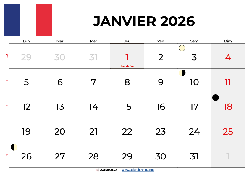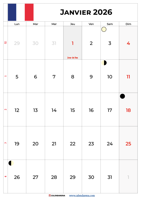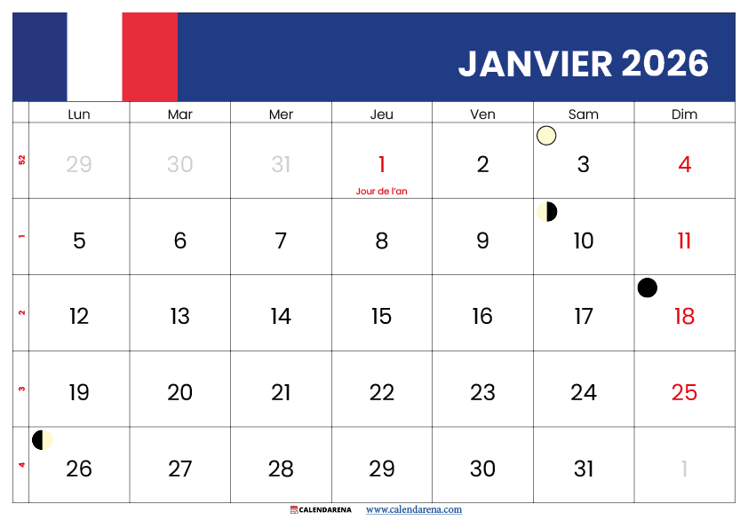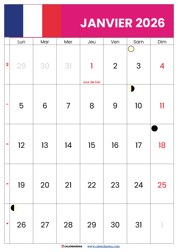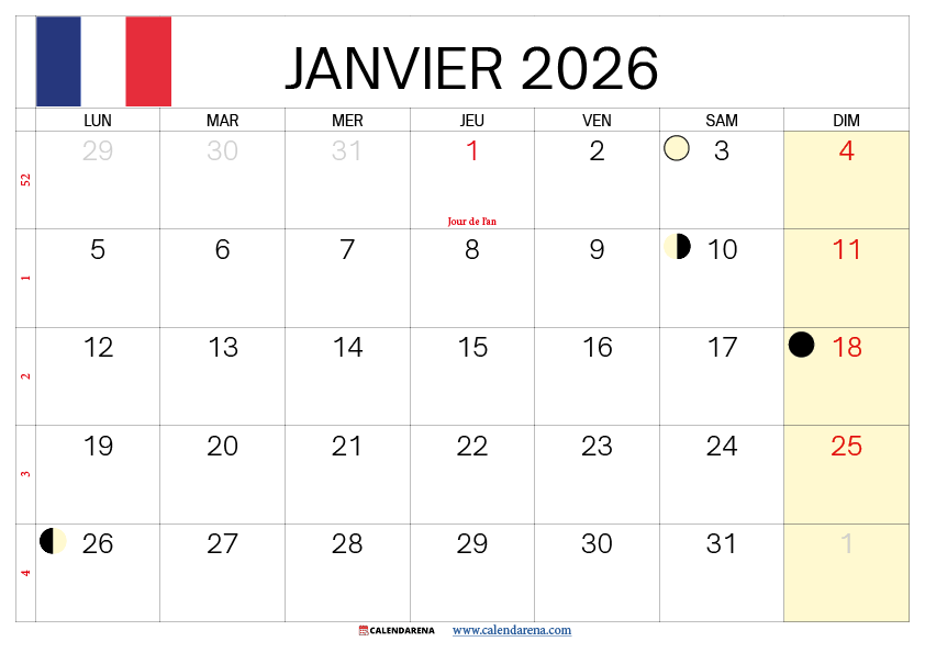 Calendrier Janvier 2026 À Imprimer Gratuit Avec Jours Fériés