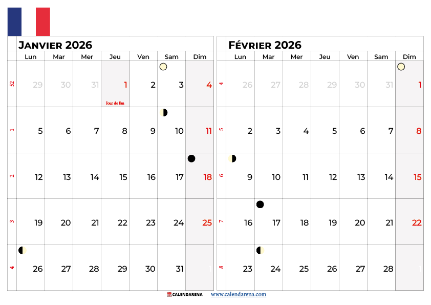 Nos calendriers janvier février 2026 à imprimer incluent: