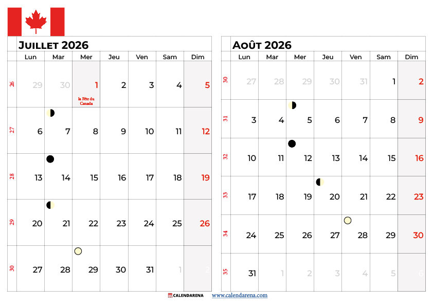 Vous cherchez un calendrier juillet aout 2026 a imprimer gratuitement? Notre site Calendarena propose des calendriers mensuels et bimestriels en formats PDF et PNG, disponibles en orientation paysage et portrait, entièrement gratuits à télécharger. Nos modèles imprimables incluent les numéros de semaine officiels du Québec, les jours fériés provinciaux et fédéraux, ainsi que des espaces pour vos notes personnelles. Ils sont optimisés pour l’impression sur papier standard A4 et lettre américain.