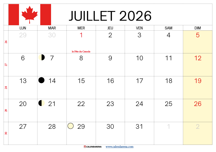 Voici le calendrier détaillé du mois de juillet 2026 avec les jours de la semaine, les jours fériés, les événements provinciaux et les dates lunaires importantes pour le Québec.