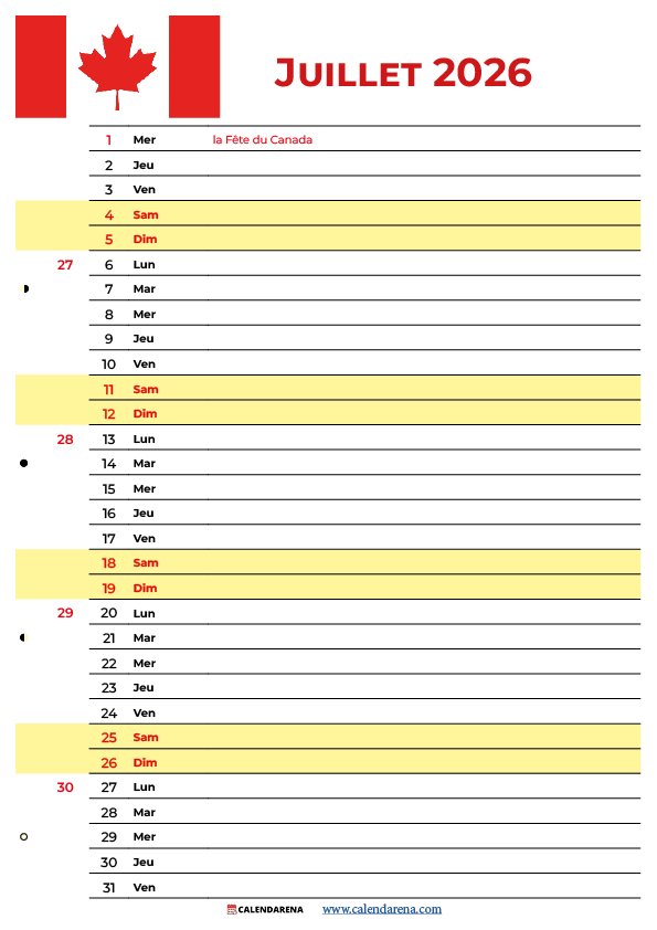 Où télécharger un calendrier juillet 2026 Québec gratuit en PDF? Téléchargez gratuitement notre calendrier mensuel sur Calendarena — Calendrier 2026 Québec, disponible en PDF et PNG, en formats portrait et paysage.