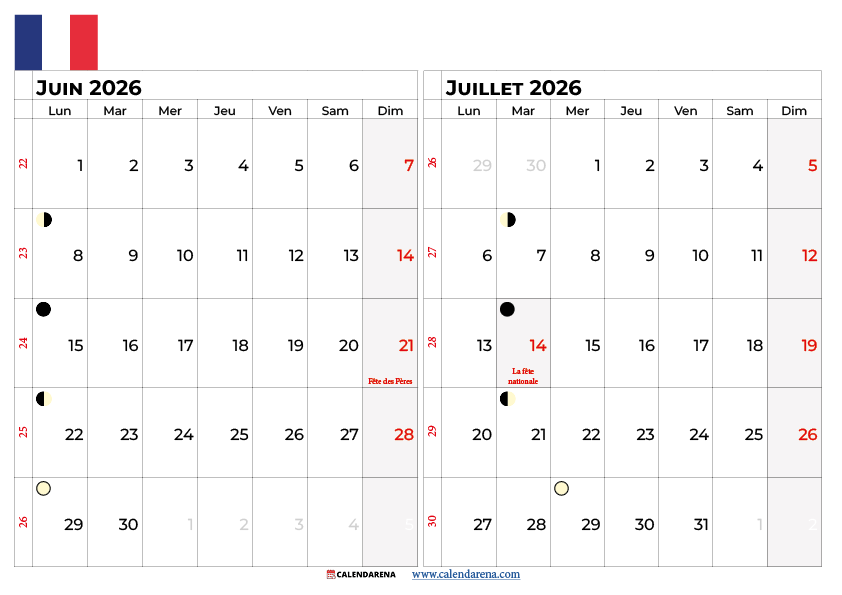 Notre calendrier 2026 juin est disponible en plusieurs formats adaptés à tous les usages : version vierge pour une personnalisation totale, version avec jours fériés et observances françaises, et version avec phases lunaires pour les passionnés d’astronomie ou les jardiniers suivant le calendrier lunaire.