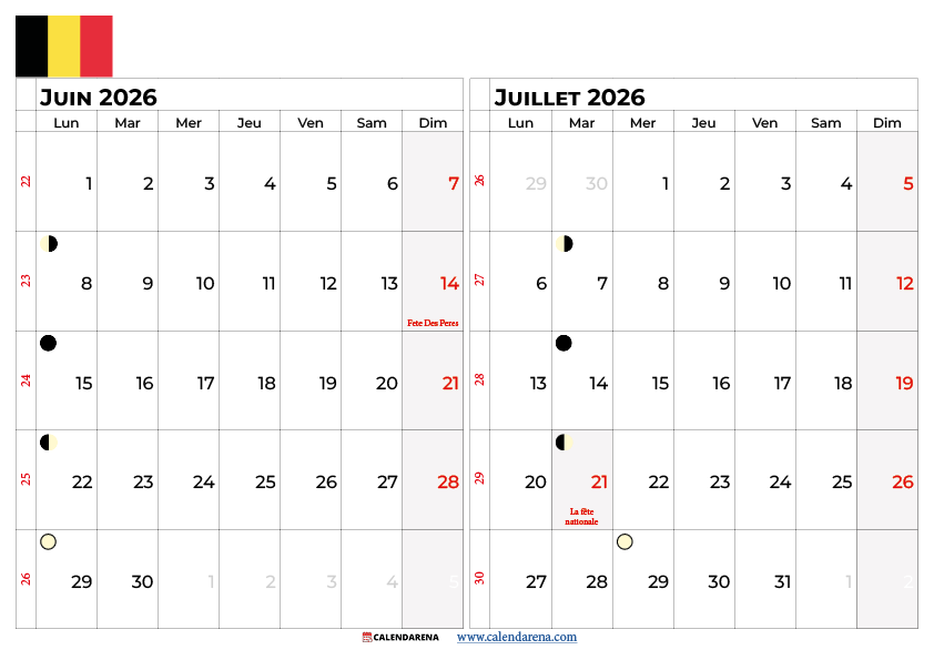Calendrier Juin Juillet 2026 Belgique