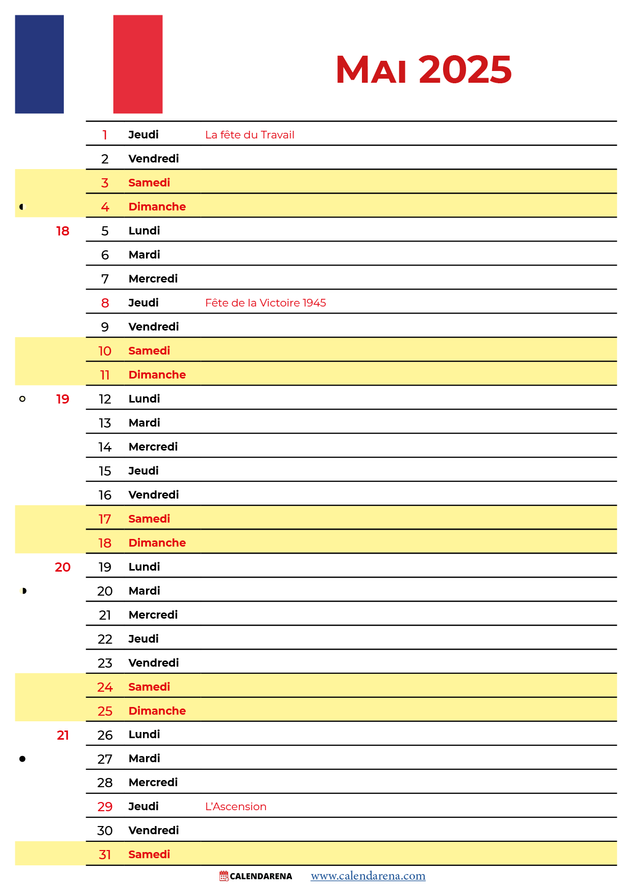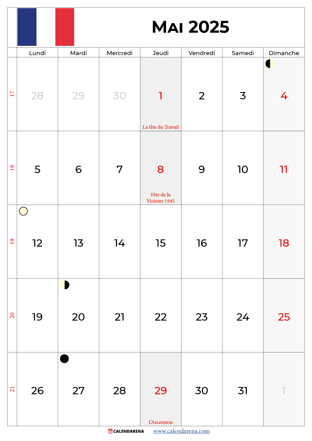 Calendrier Mai 2025 France à imprimer gratuit