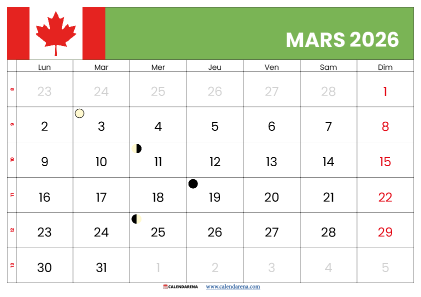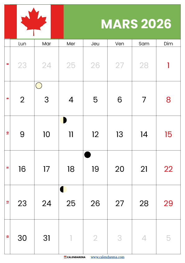 Nos modèles de Calendrier Mars 2026 À Imprimer Gratuit Québec incluent tous les événements et observances mentionnés ci-dessus. Chaque date significative est clairement identifiée, vous permettant de visualiser rapidement vos obligations et opportunités du mois.