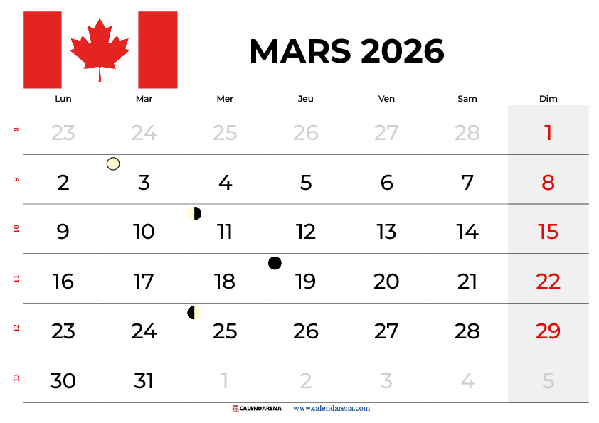 Calendrier Mars 2026 À Imprimer Québec : Vue d’Ensemble
